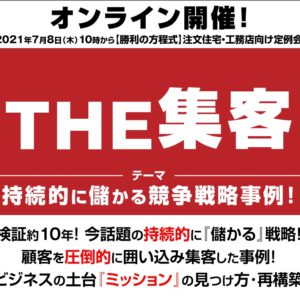 【オンライン開催】8月3日リフォーム業界グループコンサル・・・ 2021年07月01日 2021年8月3日(火)10:00~12:00リフォーム業界グループコンサルティングを開催いたします。(Zoomによるオンラインでの開催)オンラ・・・ 続きを読む 【コラム】経営者、リーダーの方へ。悲痛な叫びを知って! 2021年06月25日 最近、『コミュニケーション研修』の依頼が増えています。単発ではなく、継続的な依頼です。先日、ある建築会社さんで、10回研修の初回を開催しました。・・・ 続きを読む 【コラム】お勧めの一冊!具体的に競争戦略を解説。 2021年06月11日 人には教えたくない本があります。一人ひとりの大切にしていることが違うから、私にとって重要でも、他の人にとっては価値がないかもしれません。だか・・・ 続きを読む 【コラム】『Being(在る)』から『Becoming(・・・ 2021年06月04日 『いま・ここ』から『いま・ここ・より・善い』。ビジネス戦略専門誌の最新号より!スティーブ・ジョブズ?Google?シリコンバレーで流行ったから?・・・ 続きを読む 【オンライン開催】7月8日注文住宅・工務店向け定例会 2021年05月24日 2021年7月8日(木) 10:00~12:00注文住宅・工務店向け定例会【勝利の方程式】をオンラインで開催いたします。『勝利の方程式』定期勉強会・・・ 続きを読む 【コラム】人生はどれだけ呼吸をし続けるかで決まるのではな・・・ 2021年05月21日 5年前にSNSでシェアしたアメリカのコメディアン、ジョージ・カーリン氏の名言です。5年が過ぎて、心が豊かな社会になったのか?なんか、その逆みたいです・・・ 続きを読む 【コラム】木材不足以上の大問題?手遅れになる前に! 2021年05月08日 大変革期をチャンスにする2004年当時を思い出します。「ホームページを早く作った方がいいですよ!」 「手遅れになる前に、ホームページで集客してく・・・ 続きを読む 【オンライン開催】6月8日リフォーム業界グループコンサル・・・ 2021年05月01日 2021年6月8日(火)10:00~12:00リフォーム業界グループコンサルティングを開催いたします。(Zoomによるオンラインでの開催)テーマ・・・ 続きを読む 【お知らせ】GW期間中の休業日のお知らせ 2021年04月26日 平素は格別のご高配を賜り、誠にありがとうございます。GW期間中の休業日についてご案内申し上げます。休業日:2021年4月29日(木)、5月1日(土)・・・ 続きを読む 【コラム】社員のメンタルケアと離職防止! 2021年04月23日 コロナ禍は建築会社の社長にとって、大きな試練と学びの時間だったようです。先日の大阪出張で、このような話を伺いました。「一時は、もうダメなんじゃないか・・・ 続きを読む Page 21 of 56« First‹ Previous171819202122232425Next ›Last »