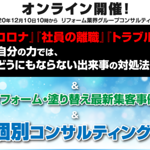 【オンライン開催】3月11日注文住宅・工務店向け定例会 2021年01月25日 2021年3月11日(木)10:00~12:00注文住宅・工務店向け定例会【勝利の方程式】をオンラインで開催いたします。『勝利の方程式』定期勉強会・・・ 続きを読む 何の数字か分かりますか? 9月10月11月設備工事スタッフ10414175リフォームの施工管理スタッフ15214788下水道工事の提案営業職270278172完全反響型のリフォーム営業83147102 これは!ナント!求人募・・・ 続きを読む 【コラム】成功を続ける! 2021年01月08日 「成功とは何だろう?」そんなことをふと考えていました。そこで、インターネットで調べてみました。(https://www.businessinsi・・・ 続きを読む 【お知らせ】冬季休業のお知らせ 2020年12月22日 冬季休業のお知らせ平素は格別のご高配を賜り、誠にありがとうございます。冬季休業日についてご案内申し上げます。冬季休業日:2020年12月26・・・ 続きを読む 【オンライン開催】2月16日リフォーム業界グループコンサ・・・ 2020年12月21日 2021年2月16日(火)10:00~12:00リフォーム業界グループコンサルティングを開催いたします。 (Zoomによるオンラインでの開催)&・・・ 続きを読む 【オンライン開催】1月14日注文住宅・工務店向け定例会 2020年12月21日 2021年1月14日(木)10:00~12:00注文住宅・工務店向け定例会【勝利の方程式】をオンラインで開催いたします。『勝利の方程式』定期勉強会・・・ 続きを読む 参加者が自宅で参加できる夜の建築系オンラインセミナー!ホ・・・ 平日の20時から22時までの夜間の時間帯で、オンラインライブ配信の「家づくりセミナー」を企画しました。 広告費はできる限りかけたくないので、Webからの集客に絞る 参加者がいなければ開催しない 事務所からオンライン配信なので会場費はかからない果たして申し込みは来るのだろうか? 来たよ!来まし・・・ 続きを読む コンバージョン精度が上がる! 1.工務店:Google広告の平均コンバージョン単価@26,741円月額広告費70万円、月間平均反響40件2.ガーデニング会社:Google広告の平均コンバージョン単価@3,919円月額広告費30万円、月間平均反響100件3.塗装会社:Google広告の平均クリック単価@25円月額広告費35万円、月間平均反響40件&nbs・・・ 続きを読む 【オンライン開催】12月10日リフォーム業界グループコン・・・ 2020年11月24日 Zoomを使ったオンライン開催にて、リフォーム業界グループコンサルティングを開催いたします。ゲストに志賀塗装株式会社の志賀社長をお迎えします。当・・・ 続きを読む 【コラム】なぜ、生きていくのか?日常の出来事が「心」を曇・・・ 2020年11月20日 『このままでいいのだろうか?』と、ときどき思う。社員を幸せにできるのだろうか?お客様の役に立っているのだろうか?家族は?妻は幸せなのだろ・・・ 続きを読む Page 23 of 56« First‹ Previous192021222324252627Next ›Last »