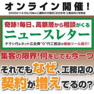 【コラム】『時間』と『仕事』の主人公になる唯一の方法! 2020年11月13日 先人は凄い。「時間」と「仕事」に振り回されない方法を残してくれている。それもシンプルなやり方で…。影響は少なくない。コロナ禍は、これまで・・・ 続きを読む ビジネスのお手本!毎日問い合わせが入る、23年10カ月続・・・ 涙が出ちゃいます。 「ノリオちゃんたちとさ、チャーハン食べに行って、飯がのど…通らないんだよ…。軽いウツっていうんだろうな…。あの時、ニュースレターも止めようと思っていた…。だけどさ、ノリオちゃんがこれだけは止めちゃダメだって…。ありがと…」 地元の先輩が営む工務店さんのニュースレターです。26年続く弊社・・・ 続きを読む 【コラム】言葉は魔法 2020年11月06日 もっとお客様に喜んでもらいたい。全社員の物心両面の幸福を追求したい。 稲森和夫さんの受け売りだけれど、日々、こんなことを考えな・・・ 続きを読む ディスプレイネットワーク広告の反響がスゴイ! ※GDNとはGoogle ディスプレイネットワークの略称。YDNとはYahoo! ディスプレイアドネットワークの略称。どちらもディスプレイ広告を配信する広告ネットワークのことを指します。 コンピューターに働かせる!シルバーウィーク後半の2日間は、予約制見学会満席!資料の赤いラインの部分をご覧ください。わずか1カ月・・・ 続きを読む オンラインライブセミナー『ホームページ集客の極意』 2020年10月09日 最新Web集客の成功事例!コロナ禍でも業種を超え成功しているホームページ戦略とは?業種が違っても広告費を使わず全国No.1、業界No.1、地域No.1の・・・ 続きを読む 【オンライン開催】11月10日注文住宅・工務店向け定例会 2020年10月08日 2020年11月10日10時から2時間注文住宅・工務店向け定例会【勝利の方程式】をオンラインで開催いたします。『勝利の方程式』定期勉強会http・・・ 続きを読む ビジネスに繋がらない『空き家』セミナー、大きなビジネスに・・・ たくさん学んだ(失敗を繰り返した)!そして見つけた、高収益ビジネスモデル!&集客もバッチリ!ビジネスパートナーである近所の工務店さんや一級建築士さんとコラボレーションして、ジョイントセミナーの開催を始めてから3年が経ちました。弊社は集客とコーディネートを担当。パートナーは家づくりの専門家として、セミナー参加者に知識や知恵を提供。・・・ 続きを読む 【コラム】愛を伝えよう! 2020年09月25日 創造と破壊コロナで変わった。後戻りしない変化も起きている。コロナが沢山教えてくれる。そんな時、日本を代表する脳科学の先生の言葉にショックを受・・・ 続きを読む 【コラム】会社が社員を必要とする時代から、社員から必要と・・・ 2020年09月18日 唯一の競争力要因は人材。しかし、差がつくのは働かせ方!弊社の営業マンが誇らしげに報告してくれました。「うちの会社に全部任せてくれるそうです。そし・・・ 続きを読む ライバルの広告費の概算が分かる! 今すぐ客の集客は大切!便利な世の中になりました。ライバルの広告予算が分かってしまうのです。ですから、ライバルとの距離感というのでしょうか?相手のGoogle広告戦略の概要が分かるのです。資料1-1をご覧ください。あるクライアントさんのGoogleの管理画面です。[caption id="attachment_4595" a・・・ 続きを読む Page 24 of 56« First‹ Previous202122232425262728Next ›Last »