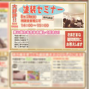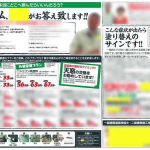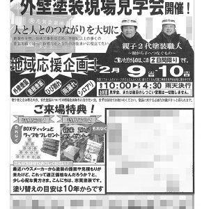 塗装 『今すぐ客』が集まる塗装見学会! 2019年03月22日 『今すぐ客』集客のコツ!参加者のほぼ100%が成約! 以下のチラシは、志賀塗装株式会社さんの事例です。気をつけてくださいね。・・・ 続きを読む 見込み度の高い優良顧客を集客する方法 2019年03月01日 先週末、「建替え?それともリフォーム?」をテーマにしたセミナー集客を試みました。 一組当たりの集客単価は、20,523円。そし・・・ 続きを読む お客様を動かすために 2019年01月17日 先日届いたある会員さんのニュースレターに入っていた案内チラシが気になりました。「消費税率10%への引き上げ後の住宅取得にメリットがでる支援策を用意!・・・ 続きを読む トイレ交換のほぼ100%が外壁診断を申し込む。外壁相談の・・・ 2018年11月07日 トイレ交換のほぼ100%が外壁診断を申し込む。外壁相談のほぼ100%がトイレ交換を希望する。 志賀塗装さんが「外壁塗装&トイレ館」をオ・・・ 続きを読む チラシ集客が「いいね」 独立1年半で年商4億円! 2018年10月11日 チラシ集客が「いいね」独立1年半で年商4億円! 『補助金リフォーム』『耐震リフォーム』『塗替え・張替え』『新築/建替え注文・・・ 続きを読む 売上アップにつなげるには 2018年09月07日 イベントで期待したいのは、もちろん新規客の集客ですね。 しかし、関係性が出来ているOBのお客様をイベントに集客することは、時間をか・・・ 続きを読む 成約率80%の広告事例 2018年06月25日 成約率の高いセミナー集客が注目されています。 こちらの塗装セミナー。広告から集客したお客様の成約率は80%。 ・・・ 続きを読む 定番チラシの基本定義 2018年03月29日 今までとは違うチラシのパターンにチャレンジし、成功したチラシ事例をご紹介します。 塗装の一本釣りチラシ・・・ 続きを読む 必要不可欠な販促ツール 2017年12月13日 本日は会員さんの事例をご紹介します。ニュースレターの目的は、OB様との繋がりとしてのアフターフォロー、そして、見込みのあるお客様を育成することですね・・・ 続きを読む 顧客の変化に目を向ける 2017年12月05日 ショールームでイベントを行う際、複数のメーカーのショールームで行うこともあると思います。今回頂いた事例は、いつものメーカーではなく、過去の開催で、・・・ 続きを読む Page 1 of 212